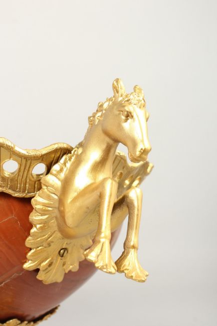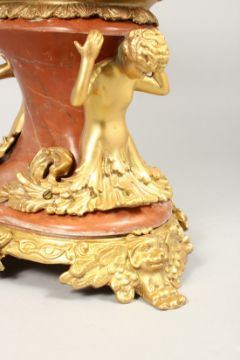 A GOOD PAIR OF RED MARBLE URNS, TWO HANDLE CENTREPIECE with ormolu cherub supports.