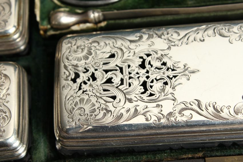 ten silver top pots, also filled with scissors, etc. the box with a fitted drawer,inset handles to the sides.