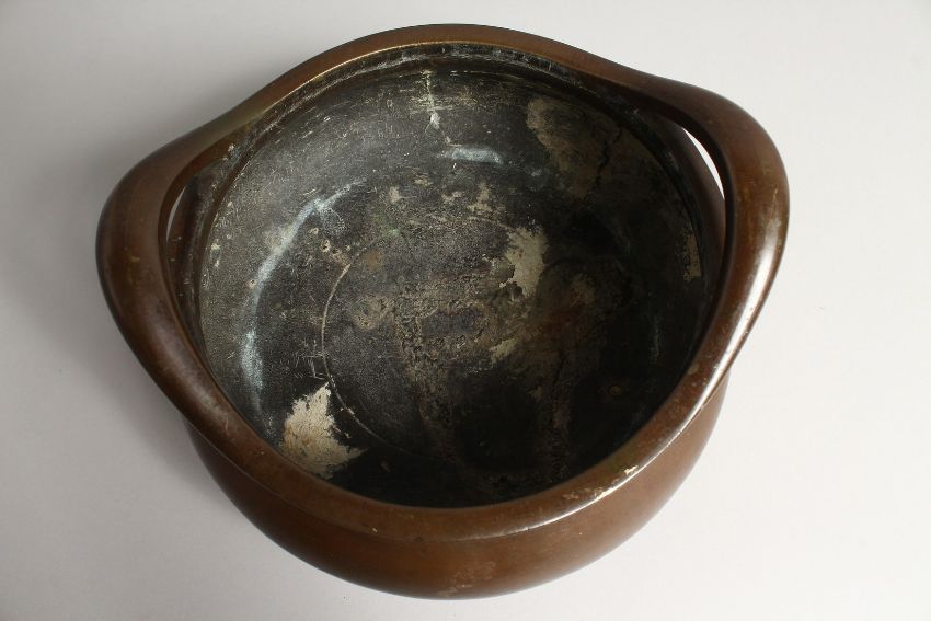 A LARGE CHINESE BRONZE TWO HANDLED CENSER on four feet.