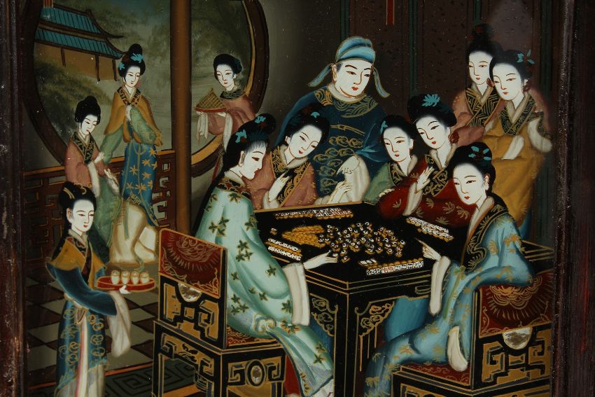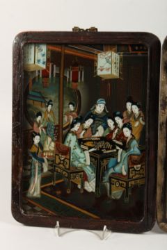 A GOOD PAIR OF CHINESE REVERSE PAINTINGS ON GLASS of two geishas and an interior with ladies playing a game.