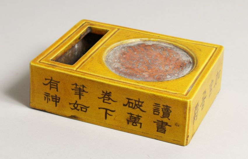 A CHINESE YELLOW PORCELAIN INK STONE with calligraphy.