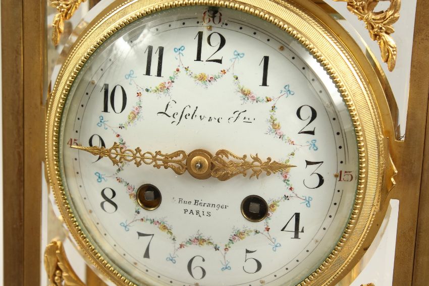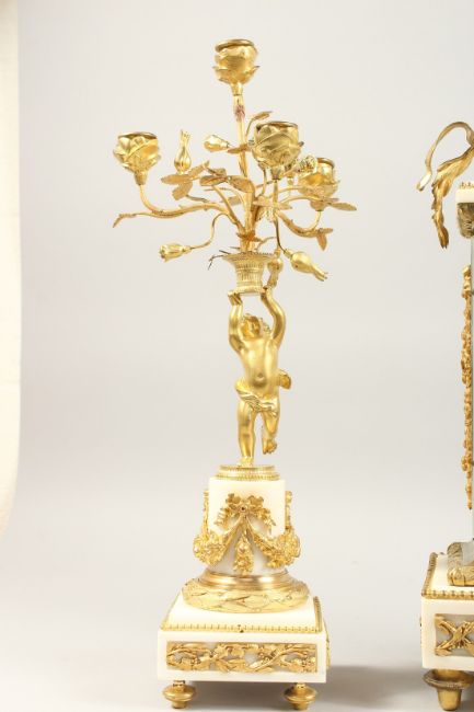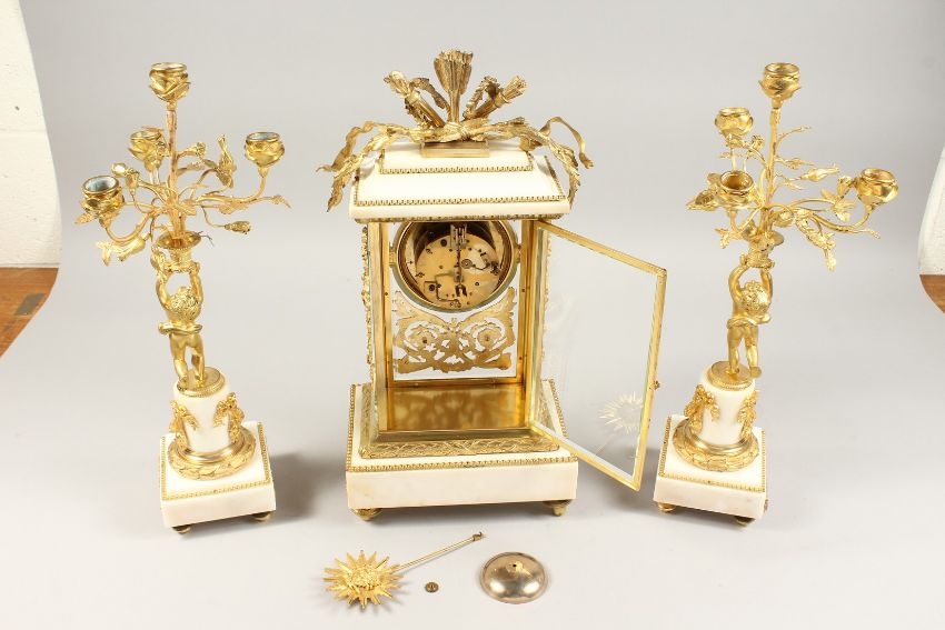 A VERY GOOD LOUIS XVITH STYLE WHITE MARBLE ONYX THREE PIECE CLOCK GARNITURE, the clock by LEFELVE FRES, Rue Beranger, Paris.