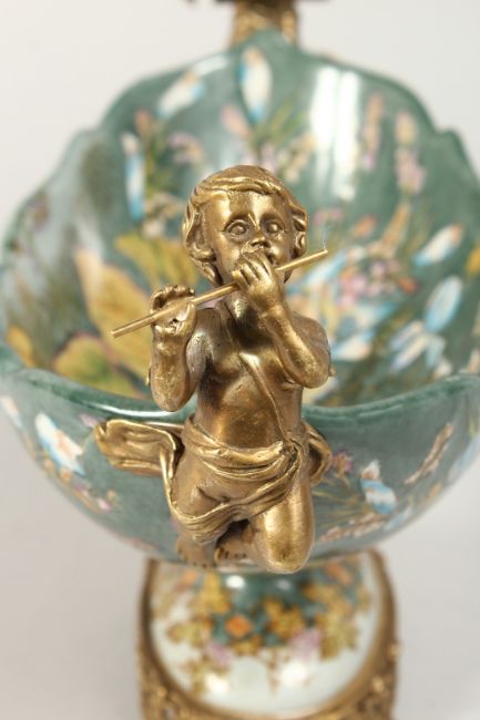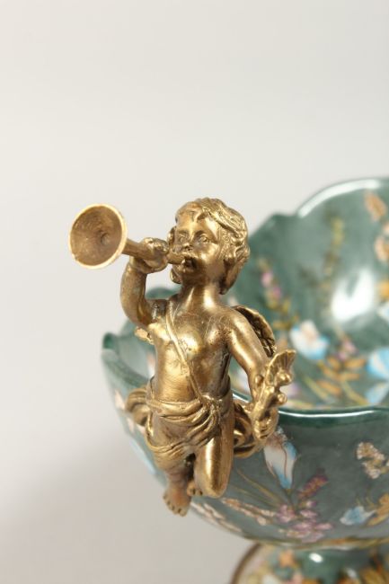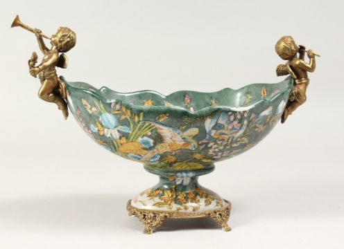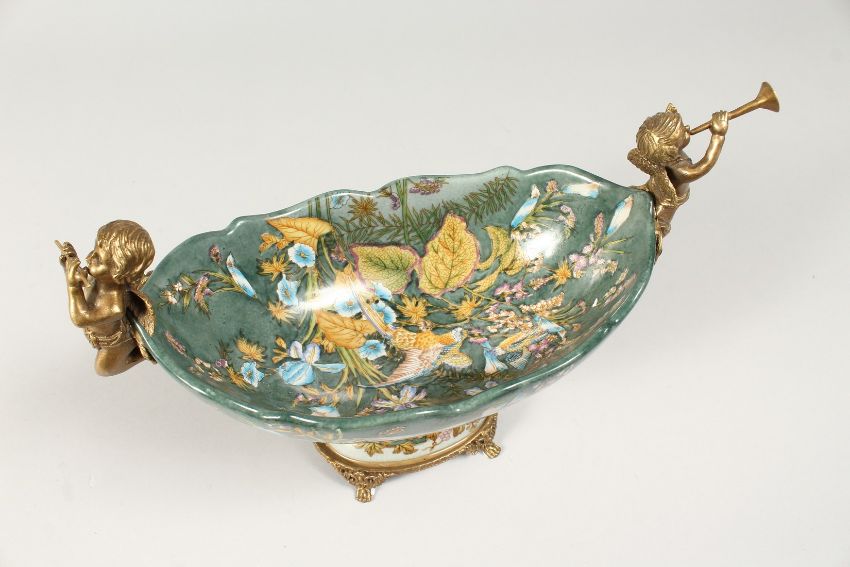 AN OVAL PORCELAIN BOWL with cherub handles