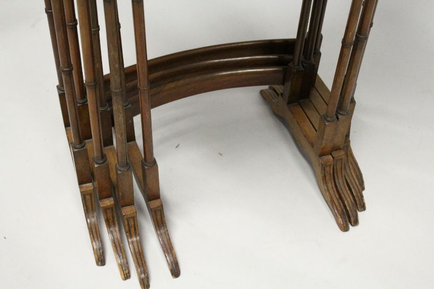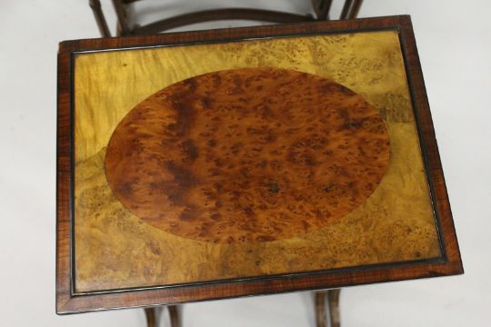 A GOOD MAHOGANY QUARTETTO, each table inlaid with a burrwood oval panel, on turned legs