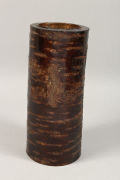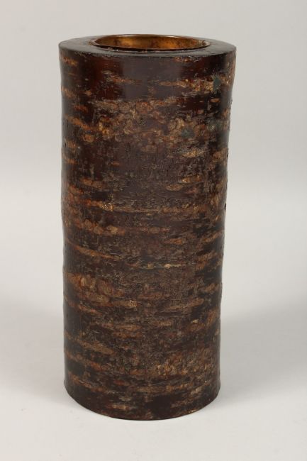 AN UNUSUAL CYLINDRICAL TREE BARK VASE.