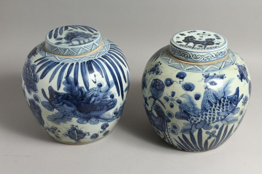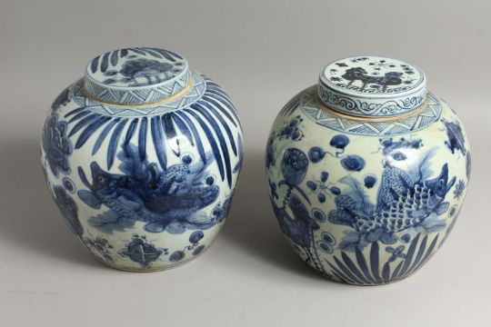 A PAIR OF CHINESE BLUE AND WHITE GINGER JARS AND COVERS with fish.