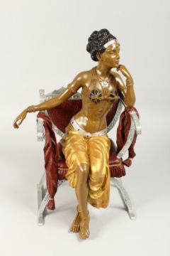 A PAINTED BRONZE GIRL seated in a chair.