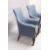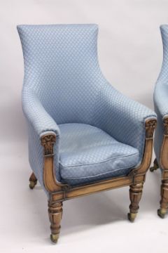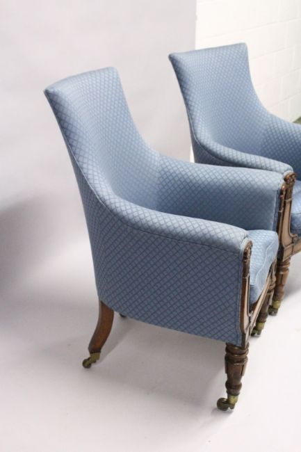 A VERY GOOD PAIR OF WILLIAM IV ROSEWOOD FRAMED BERGERE CHAIRS with blue padded upholstery and caned frame on formed legs with brass casters.