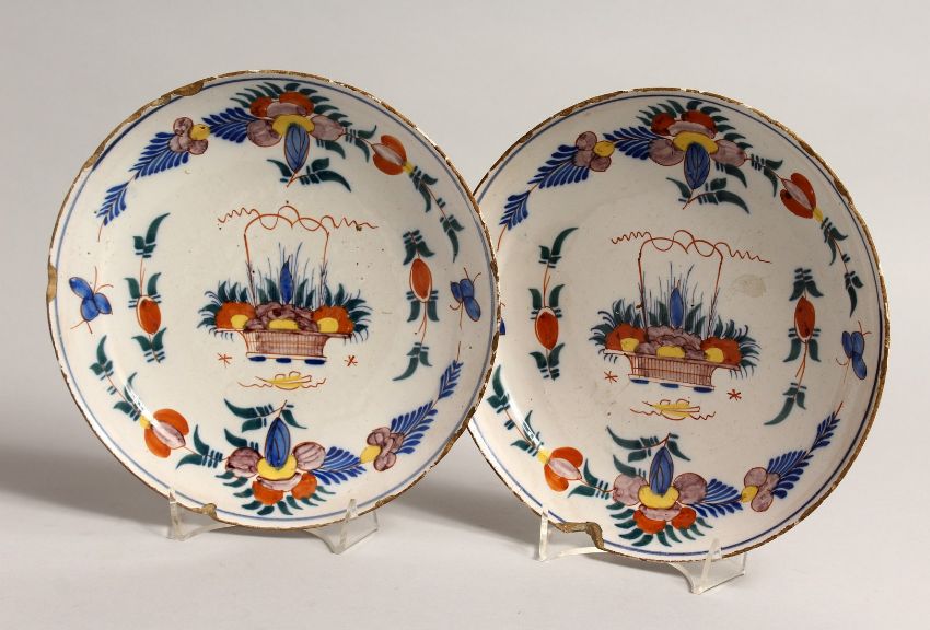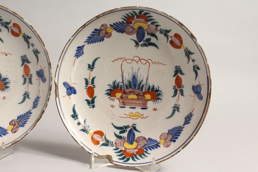 A PAIR OF 18TH CENTURY DUTCH DELFT TIN GLAZED PLATES with coloured enamels.