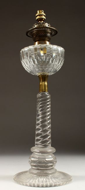 A GOOD VICTORIAN GLASS OIL LAMP on a circular base.