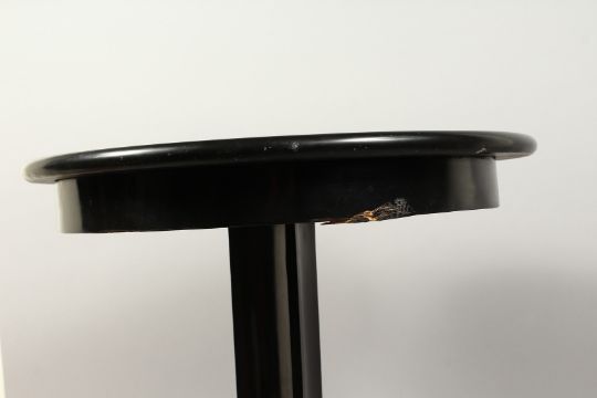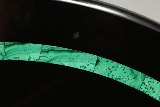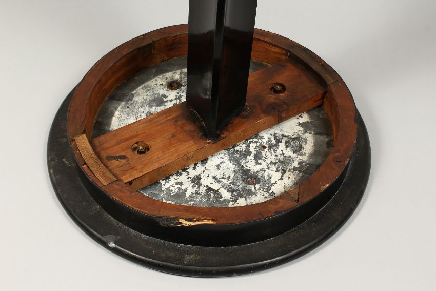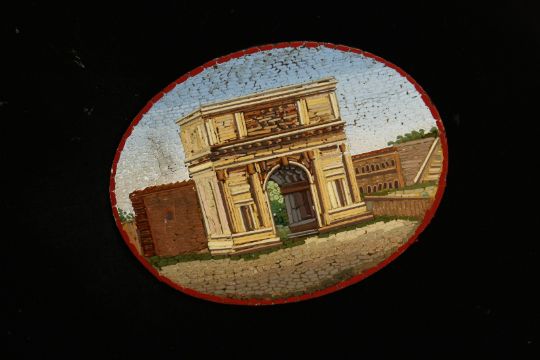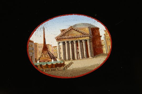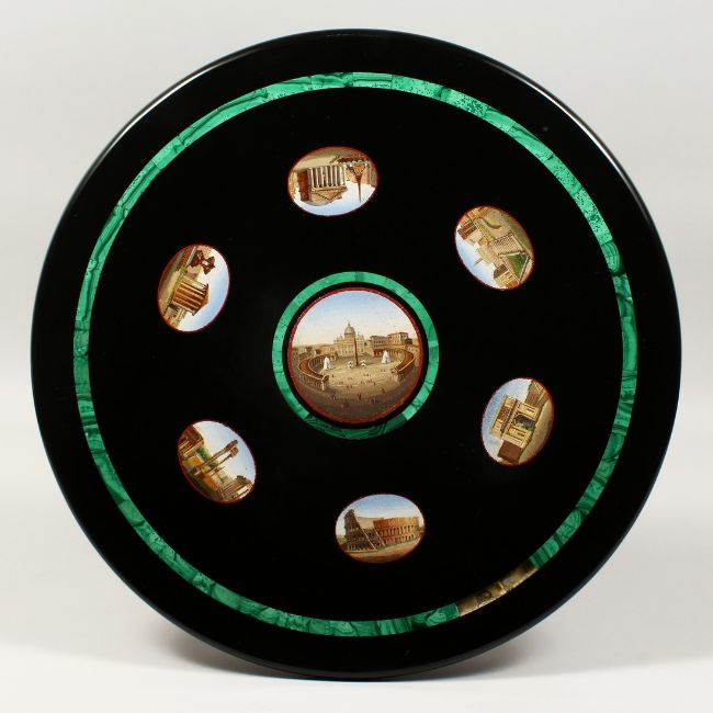 A VERY GOOD 19TH CENTURY ITALIANCIRCULAR SLATE AND EBONISED PEDESTAL TABLE, the top inset with circular micro mosaic panels, each depicting Roman building and ruins, within a malachite border, the concave sided column support terminating with three curving legs and turned feet.