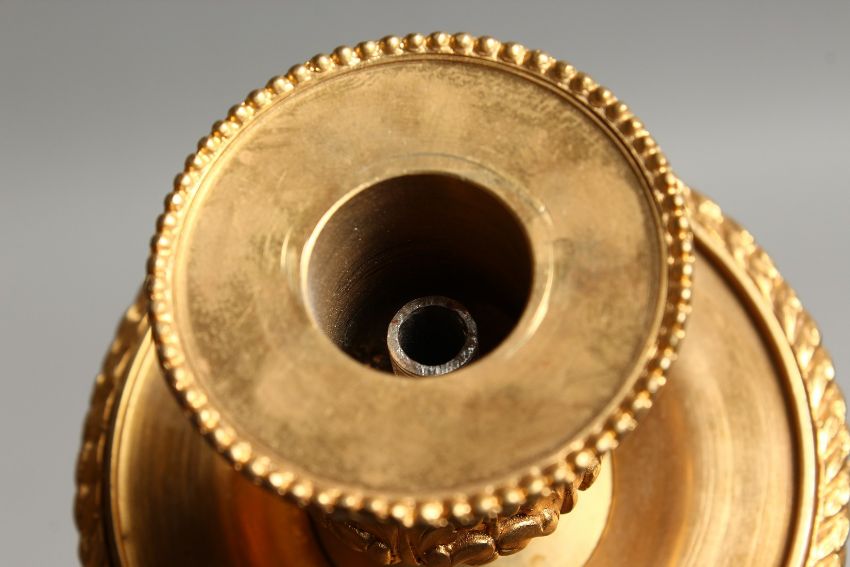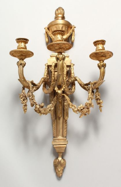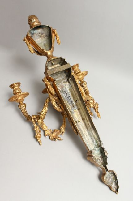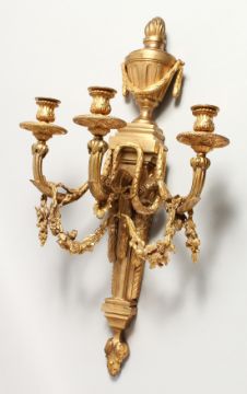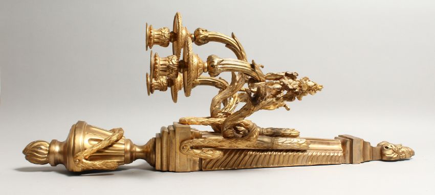 BARBEDIENNE - A GOOD ORMOLU BRONZE WALL LIGHT, with urn shaped finials, three scrolling branches with pendant drops. Stamped Barbedienne.