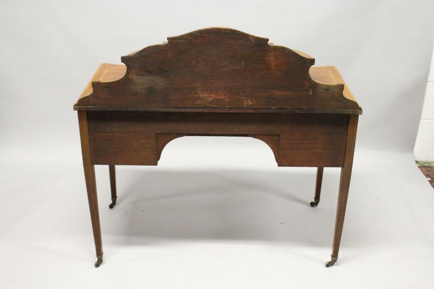 A SHERATON REVIVAL LADIES MAHOGANY AND SATINWOOD BANDED WRITING DESK, the upper section with two small drawers and pigeon holes above a leather inset writing surface, a central drawer flanked by four small drawers on tapering square legs with brass castors.