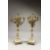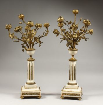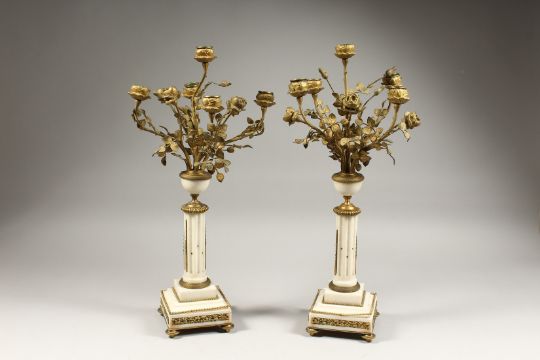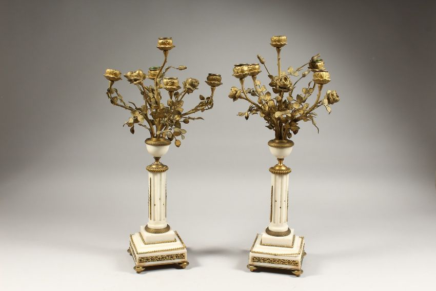 A GOOD PAIR OF LATE 19TH CENTURY MARBLE AND ORMOLU FIVE LIGHT CANDELABRA. modelled as an urn of roses, supported on a fluted column with stepped base on turned feet.