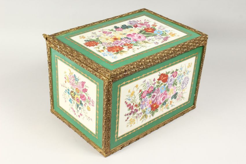 A GOOD SEVRES DESIGN RECTANGULAR CASKET painted with three floral porcelain panels