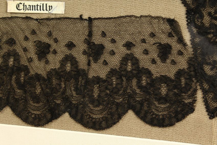 FIVE PIECES OF BLACK CHANTILLY LACE, framed and glazed.