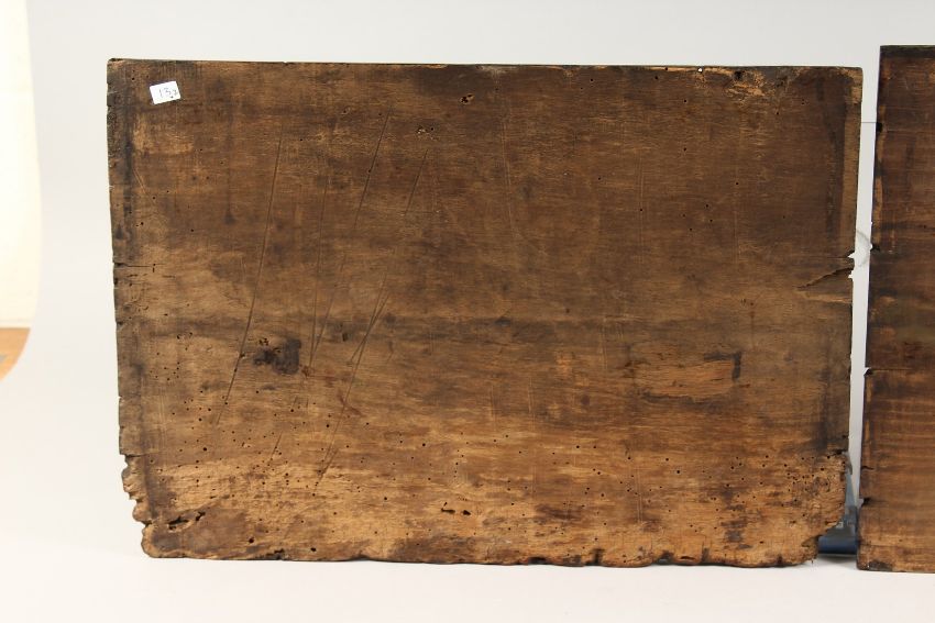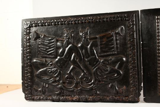 AN EARLY PAIR OF CARVED METAMORPHIC BLACK WOODEN PANELS.