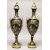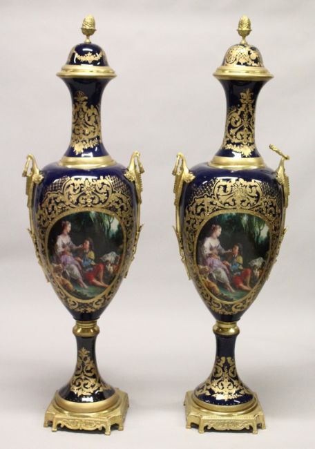 A LARGE PAIR OF PORCELAIN AND ORMOLU URNS ON STANDS in the Sevres style, decorated with panels of landscapes and romantic scenes.