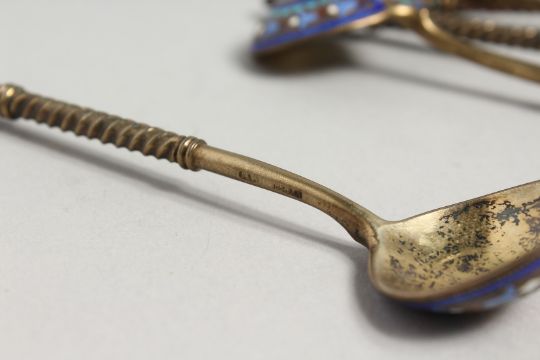 A SET OF SIX RUSSIAN SILVER AND ENAMEL SPOONS