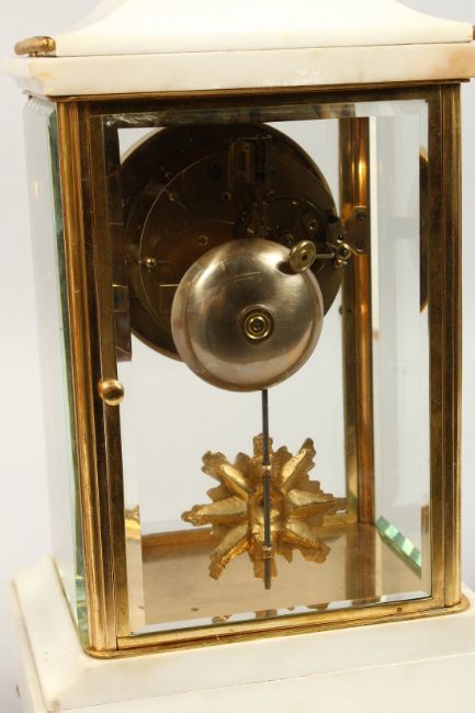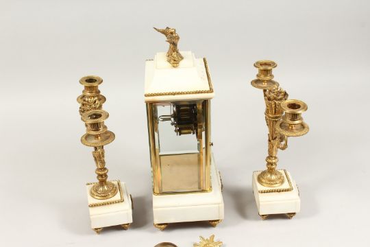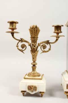 A GOOD FRENCH LOUIS XVITH DESIGN WHITE MARBLE AND ORMOLU THREE PIECE CLOCK GARNITURE, the clock with circular dial.