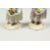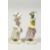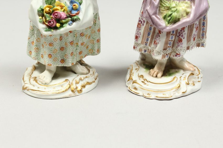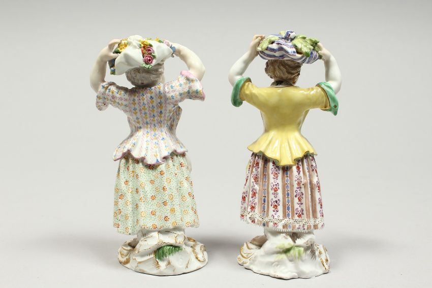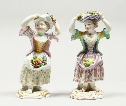 TWO SMALL MEISSEN PORCELAIN FIGURES OF YOUNG GIRLS holding a bundle above their head , with flowers in their aprons.