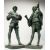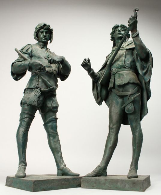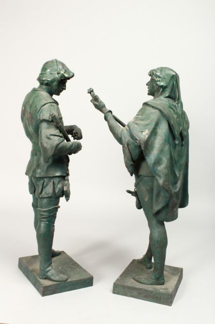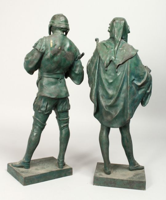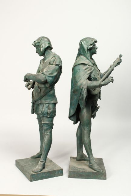 A GOOD PAIR OF BRONZE FIGURES OF YOUNG MEN, one playing a mandolin, the other on bugle.
