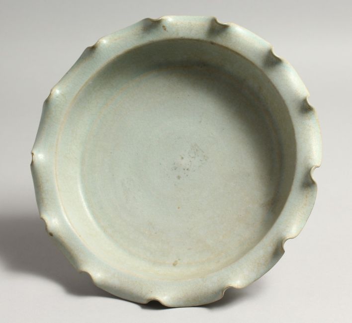 A CHINESE GREEN SHAPED DISH with wavy rim.