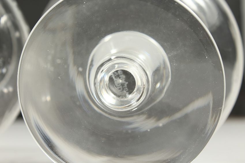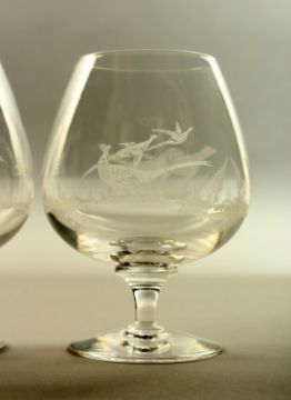 A SET OF FOUR BRANDY BALLOONS, each ethced with dogs and birds