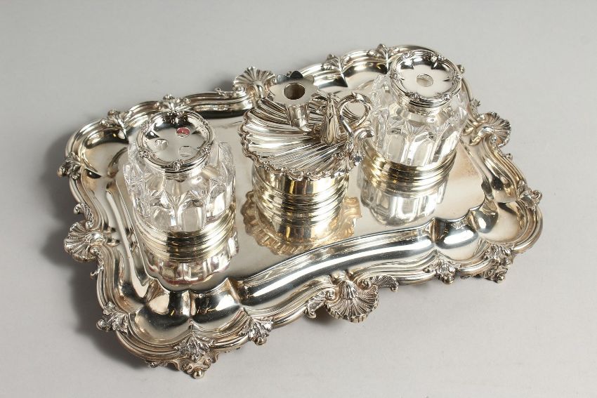 A SUPERB WILLIAM IV SILVER INKWELL with two silver glass bottles and shell shaped chamber stick.
