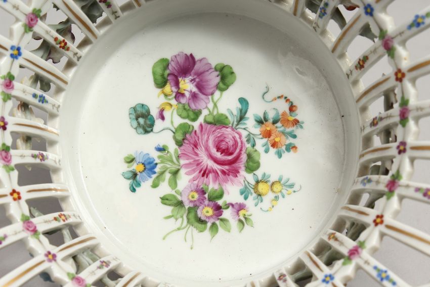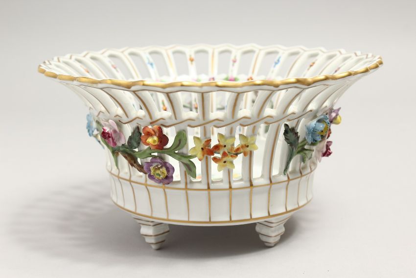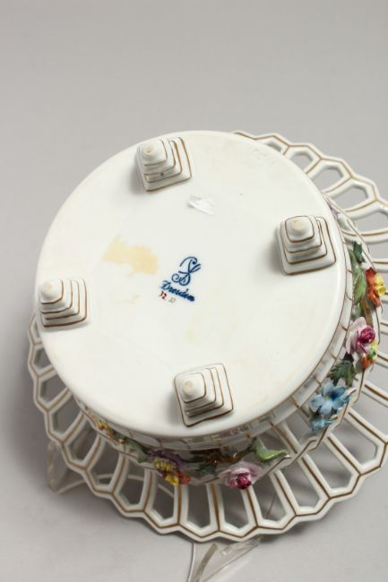 A DRESDEN PORCELAIN BASKET, pierced sides with floral painted and encrusted decoration