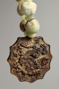 A CHINESE CARVED JADE NECKLACE AND PENDANT.
