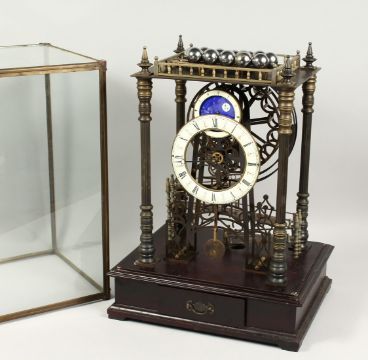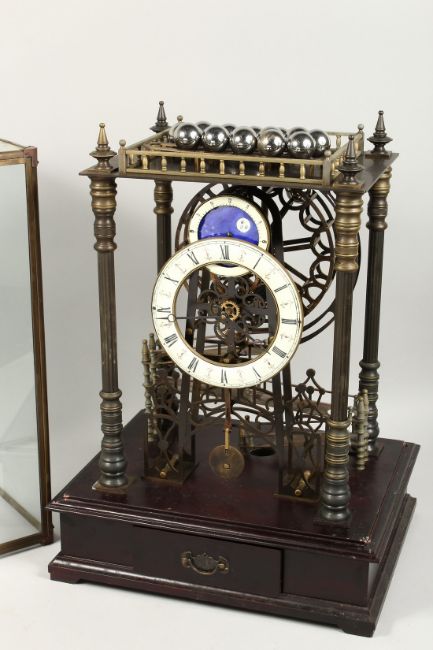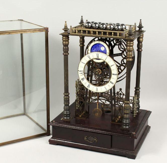 A GOOD FOUR COLUMN BRASS SKELETON CLOCK with two dials and moon face, on a stand with single drawer with glass cover.