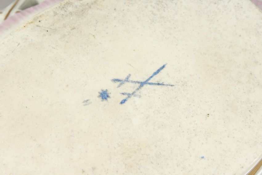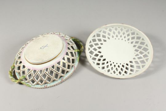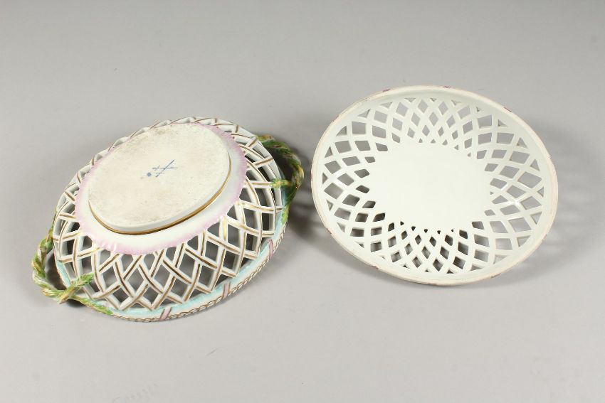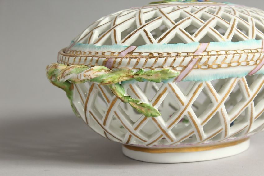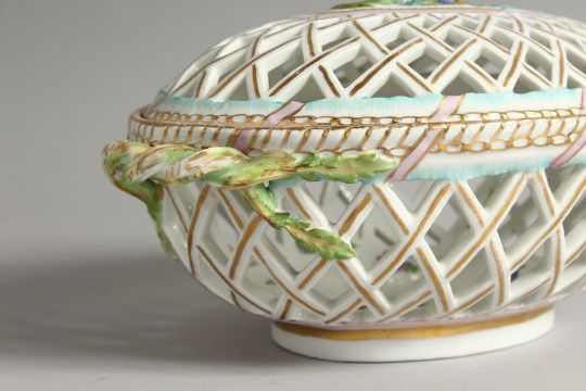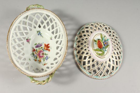 A 19TH CENTURY DRESDEN LATTICE OVAL BASKET AND COVER with fruit and rustic border.
