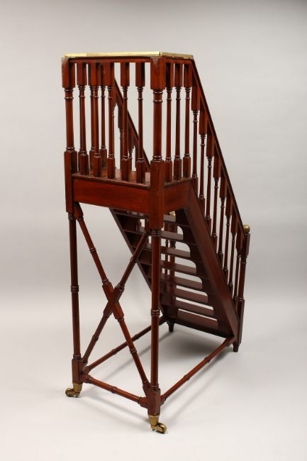 A GOOD MAHOGANY AND BRASS MODEL OF A STAIRCASE, with nine treads, platform top, brass mounted hand rail, turned spindles, on turned stretchered supports with brass casters.