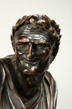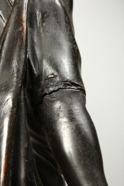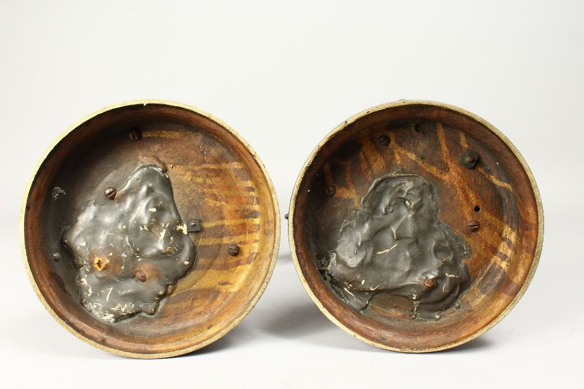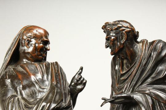 A SUPERB PAIR OF 19TH CENTURY BRONZE CLASSICAL FIGURES of a man and a woman, chickens and dead game at their feet, on circular bases.