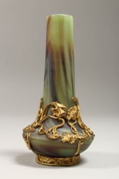 A SMALL ART NOUVEAU DESIGN MOTTLED GREEN GLASS BOTTLE VASE,overlaid with ormolu and mounts.