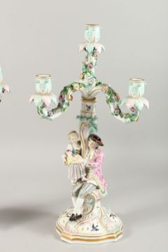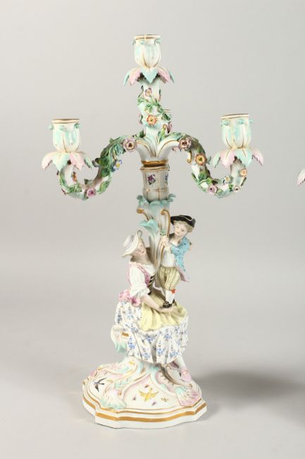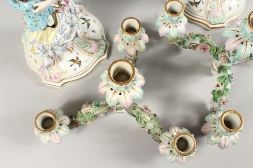 A GOOD PAIR OF 19TH CENTURY MEISSEN THREE BRANCH CANDELABRA with figures, encrusted with flowers and painted with birds.