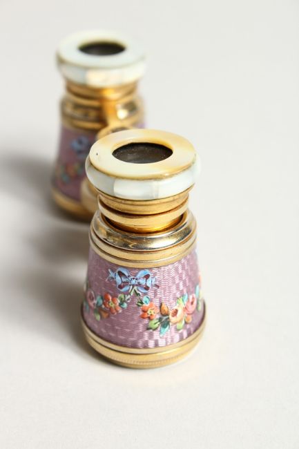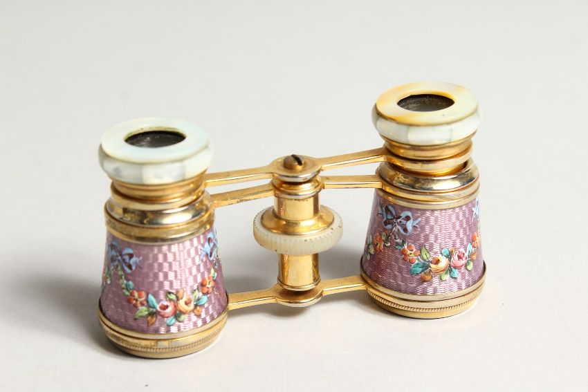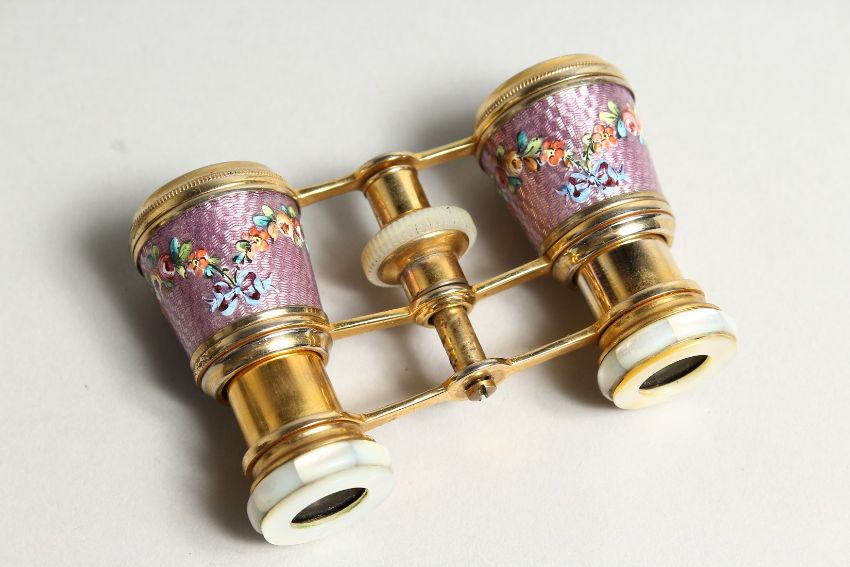 A GOOD SMALL PAIR OF ORMOLU AND LILAC ENAMEL OPERA GLASSES, painted with flowers.