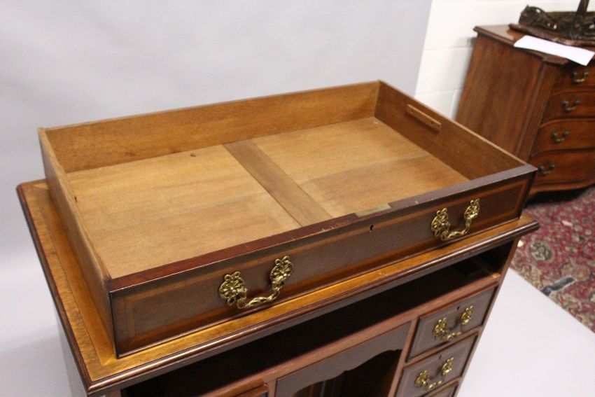 A GOOD EDWARDIAN MAHOGANY SATINWOOD BANDED AND INLAID KNEEHOLE DESK, with an inlaid rectangular top, long freize drawer, three drawers to each pedestal with small drawers and door to the centre, supported on bracket feet.