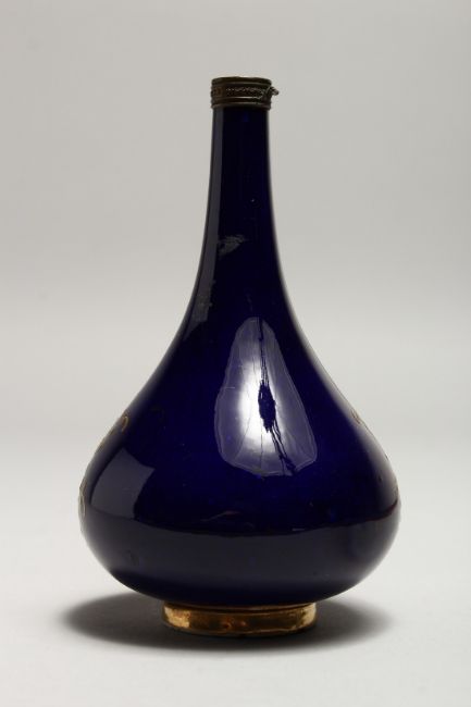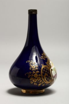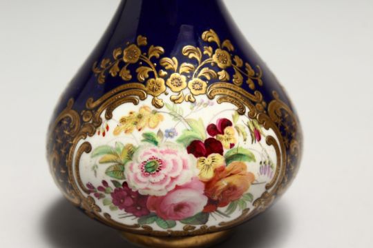 CHAMBERLAIN & CO. WORCESTER, a small porcelain bottle vase, rich blue ground painted with a panel of flowers in gilded frame.