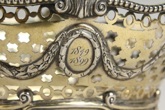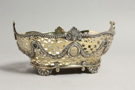 A PIERCED OVAL SILVER BASKET hung with garlands.