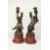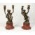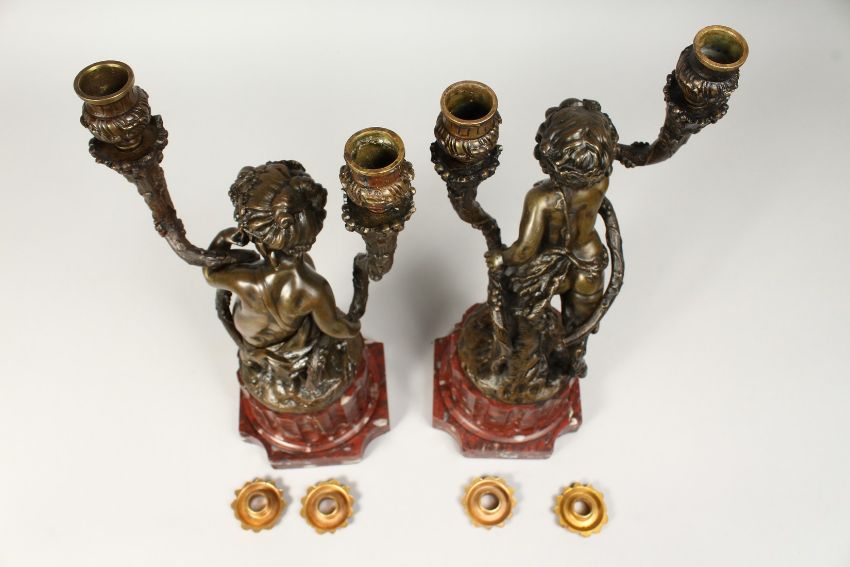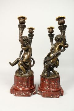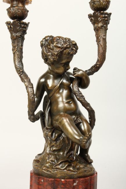 A VERY GOOD PAIR OF BRONZE CHERUB CANDLELABRA after CLODION, with scrolling branches on marble columns