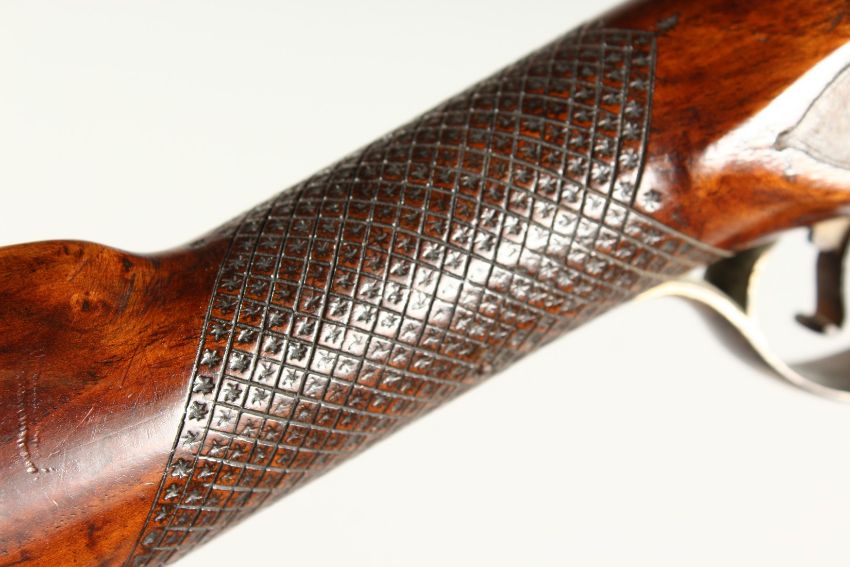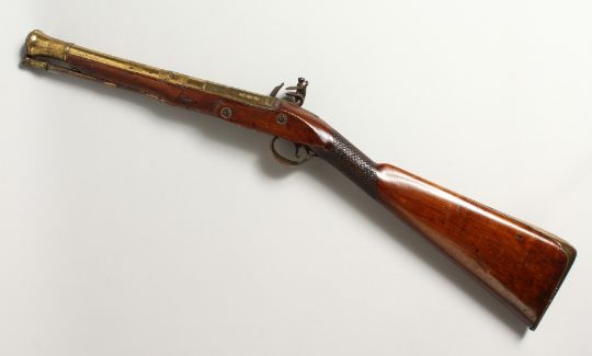 AN 18TH CENTURY BRASS BARREL FLINTLOCK BLUSTER BUSS, with mahogany stock barrel, 12 ins long, by BOND, LONDON.