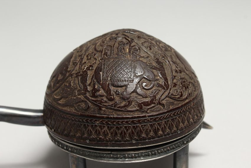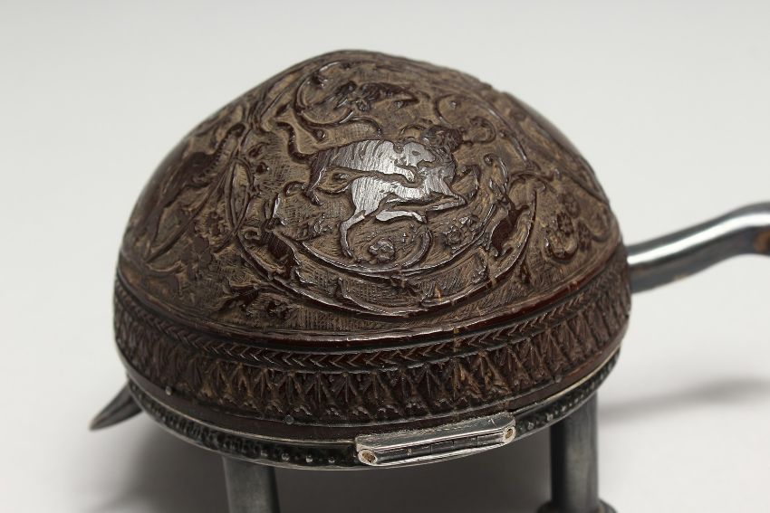A SUPERB SILVER AND ENGRAVED COCONUT TORTOISE SHAPED CLOCK, carved with elephants, with Verge movement with enamel dial. Litchenstein in Wien,