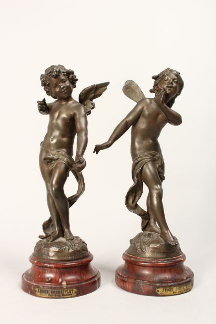 A PAIR OF 19TH CENTURY FRENCH BRONZES, CUPID AND PSYCHE on a circular base "AMOR CONBOTTANT" Par Aug Moreau