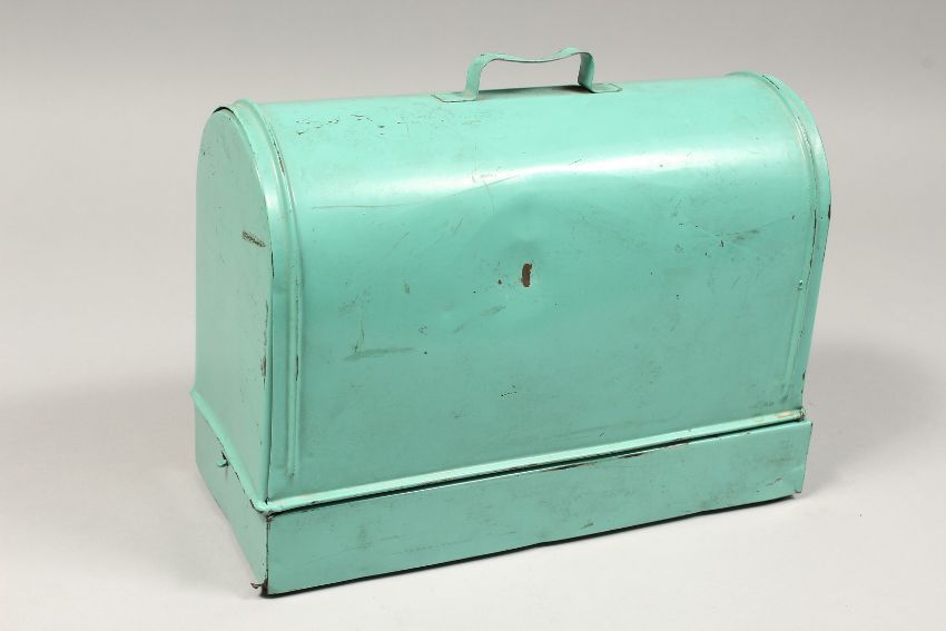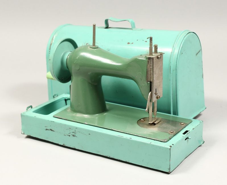 A CHILD'S TIN PLATE SEWING MACHINE AND COVER