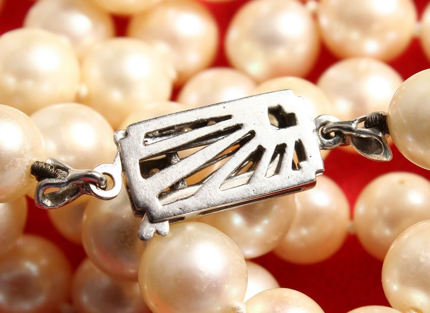 AN ART DECO STRING OF EIGHTY SEVEN PEARLS with diamond clasp.