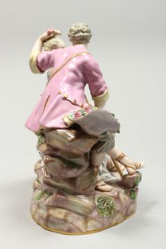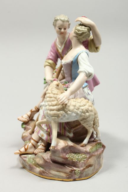 A GOOD LARGE MEISSEN PORCELAIN GROUP OF LOVERS, a lamb by her side holding a staff, the man's hat full of flowers.