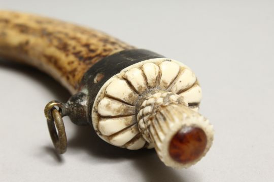 A VICTORIAN ANTLER POWDER FLASK with metal band dated 1862, the top with an acorn finial