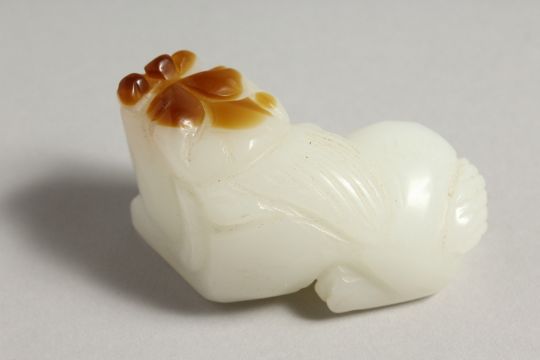 A CHINESE CARVED WHITE JADE DOG OF FOU.